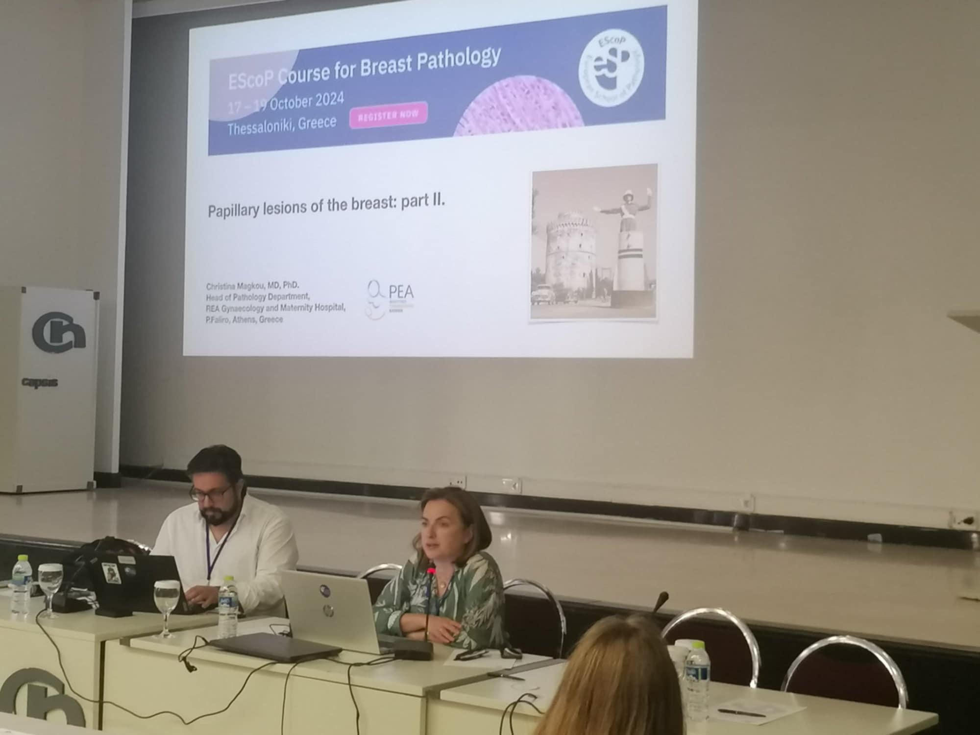 Πρόκειται για ένα τριήμερο εντατικό course για τους Παθολογοανατόμους, το οποίο διοργανώνεται από την European Society of Pathology (ESP) και πραγματοποιήθηκε για πρώτη φορά στην Ελλάδα (Θεσσαλονίκη) στις 17-19 Οκτωβρίου 2024. Στο πρόγραμμα συμμετείχαν 150 Παθολογοανατόμοι από 32 χώρες. Η κα Μάγκου συμμετείχε, ως εκπαιδεύτρια με δύο διαλέξεις για τα θηλώδη νεοπλάσματα του μαστού και ένα slide seminar με περιστατικά θηλωδών αλλοιώσεων και νεοπλασμάτων του μαστού.