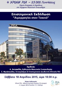 Η Κλινική ΡΕΑ σας προσκαλεί, το Σάββατο 18 Απριλίου 2015 (ώρα έναρξης 10:30 π.μ., Αίθουσα "Δημήτριος Χασιάκος" Κλινικής ΡΕΑ), στην Επιστημονική Εκδήλωση με θέμα: "Αιμορραγίες στον Τοκετό". Ομιλητές: Α. Αντσακλής, Καθηγητής Μαιευτικής Γυναικολογίας, Σ. Φωτόπουλος, Αντιπρόεδρος & Επιστημονικός Διευθυντής Κλινικής ΡΕΑ.