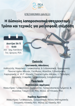 Ομιλητής: Πρωτοπαπάς Αθανάσιος, Καθηγητής Μαιευτικής Γυναικολογίας & Ενδοσκοπικής Χειρουργικής Πανεπιστημίου Αθηνών, Υπεύθυνος Μονάδας Ενδοσκοπικής Χειρουργικής Α΄ Μ/Γ Κλινικής Πανεπιστημίου Αθηνών, τ. Πρόεδρος Ελληνικής Εταιρείας Γυναικολογικής Ενδοσκόπησης.