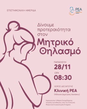Η Κλινική ΡΕΑ διοργανώνει Επιστημονική Ημερίδα με θέμα: «Δίνουμε Προτεραιότητα στον Μητρικό Θηλασμό», με στόχο την ανάδειξη της σημασίας του θηλασμού και της ορθής υποστήριξης της μητέρας και του νεογνού, μέσα από σύγχρονες επιστημονικές προσεγγίσεις και κλινική εμπειρία.