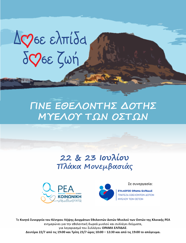 Η ΚΛΙΝΙΚΗ ΡΕΑ ΓΙΑ ΤΗΝ ΕΞΕΥΡΕΣΗ ΕΘΕΛΟΝΤΩΝ ΔΟΤΩΝ ΜΥΕΛΟΥ ΤΩΝ ΟΣΤΩΝ ΣΤΗ ΜΟΝΕΜΒΑΣΙΑ 22&23 ΙΟΥΛΙΟΥ