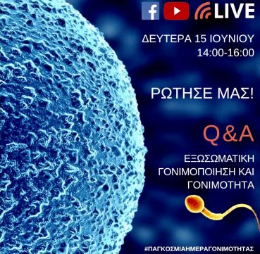 Η Κλινική ΡΕΑ με αφορμή την Παγκόσμια Ημέρα Γονιμότητας, διοργανώνει ζωντανή διαδραστική επιστημονική συζήτηση, με εξειδικευμένους ιατρούς της Μονάδας Γονιμότητας & Εξωσωματικής Γονιμοποίησης ΡΕΑ. Η ζωντανή μετάδοση της συζήτησης θα πραγματοποιηθεί στις 15 Ιουνίου και ώρες 14:00 – 16:00. Μπορείτε να την παρακολουθήσετε και να συμετάσχετε ενεργά στέλνοντας τις ερωτήσεις σας, στη σελίδα της Κλινικής ΡΕΑ στο facebook  ή στο κανάλι της Κλινικής στο youtube.
