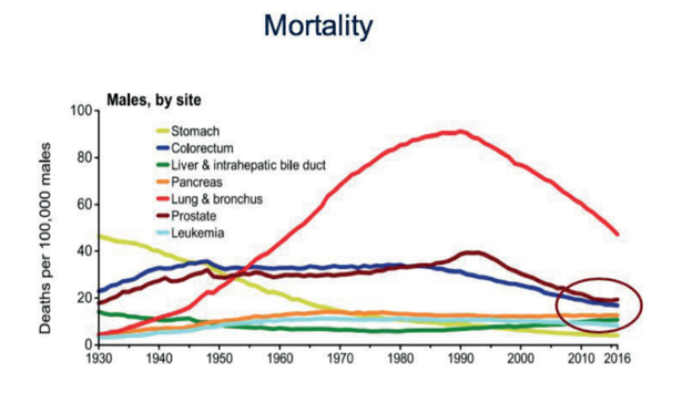 Εικόνα 1. Γραφική παράσταση της θνητότητας (ποσοστό θανάτων από τη νόσο) διαφόρων καρκίνων κατά τη διάρκεια των τελευταίων δεκαετιών στις ΗΠΑ. Ο καρκίνος του προστάτη απεικονίζεται με την καφέ γραμμή (2η αιτία θανάτου από καρκίνο στους άνδρες). Παρατηρείται η μείωση της θνητότητας από τα μέσα της δεκαετίας του 90. Αυτή αποδόθηκε στη χρήση του PSA. Με την κόκκινη γραμμή απεικονίζεται ο καρκίνος του πνεύμονα (1η αιτία θανάτου από καρκίνο στους άνδρες) και με τη μπλε γραμμή ο καρκίνος του παχέως εντέρου (3η αιτία θανάτου από καρκίνο στους άνδρες)