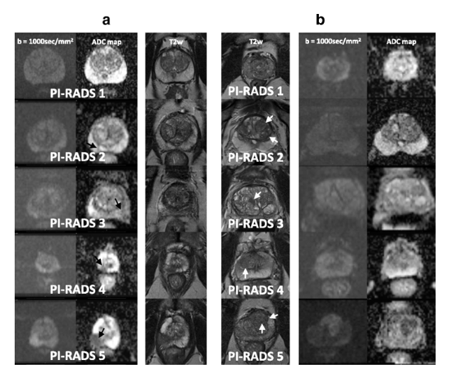 Εικόνα 2. Πολυπαραμετρική Μαγνητική Τομογραφία Προστάτη (mpMRI). Ταξινόμηση κατά PI-RADS version 2 (PIRADS I-V). Περιφερειακή ζώνη προστάτη b. Μεταβατική ζώνη προστάτη.