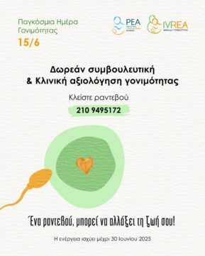 Η Μονάδα Γονιμότητας & Εξωσωματικής Γονιμοποίησης IVF ΡΕΑ, με αφορμή την Παγκόσμια Ημέρα Γονιμότητας (15 Ιουνίου), στέκεται δίπλα σε κάθε ζευγάρι και κάθε Γυναίκα που αναζητά ενημέρωση και λύσεις γύρω από τη γονιμότητα, προσφέροντας Δωρεάν συμβουλευτική & Κλινική αξιολόγηση γονιμότητας.